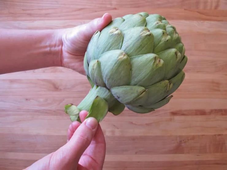 1. For each artichoke, rinse under cold water. Pat dry with a clean kitchen towel or paper towel. Remove any stray leaves from the stem of the artichoke.