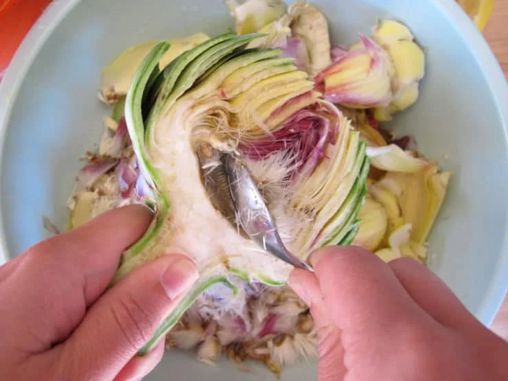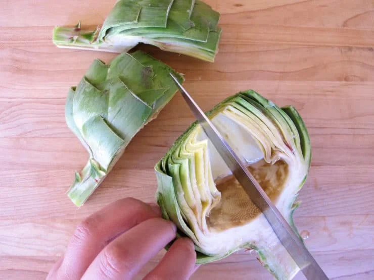 5. With a sharp chef's knife, cut the artichoke in half. Remove the furry, inedible choke with a melon baller or spoon. Rinse the artichoke to remove all pieces of the furry choke, if needed. Place in bowel of water with lemon juice immediately to keep the exposed central part of the artichoke form turning brown (oxidizing).