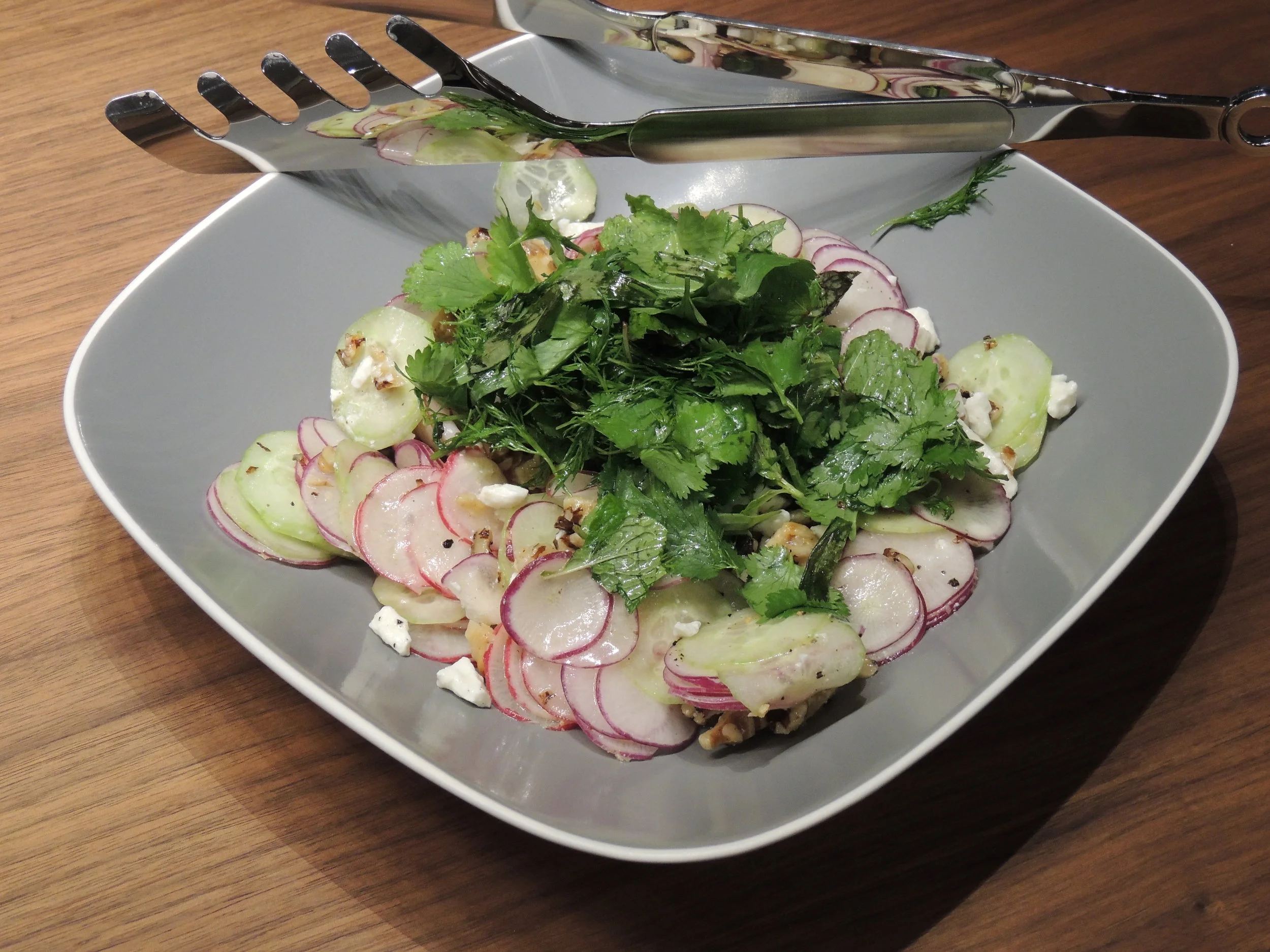 - Just before serving, season radishes, cucumbers and walnuts with a pinch of salt and dress lightly with 3 to 4 tablespoons of vinaigrette. Toss well to combine. Add crumbled cheese and toss gently to combine without breaking the cheese down too much. Arrange in a loose mound in a shallow serving bowl (or on a platter).