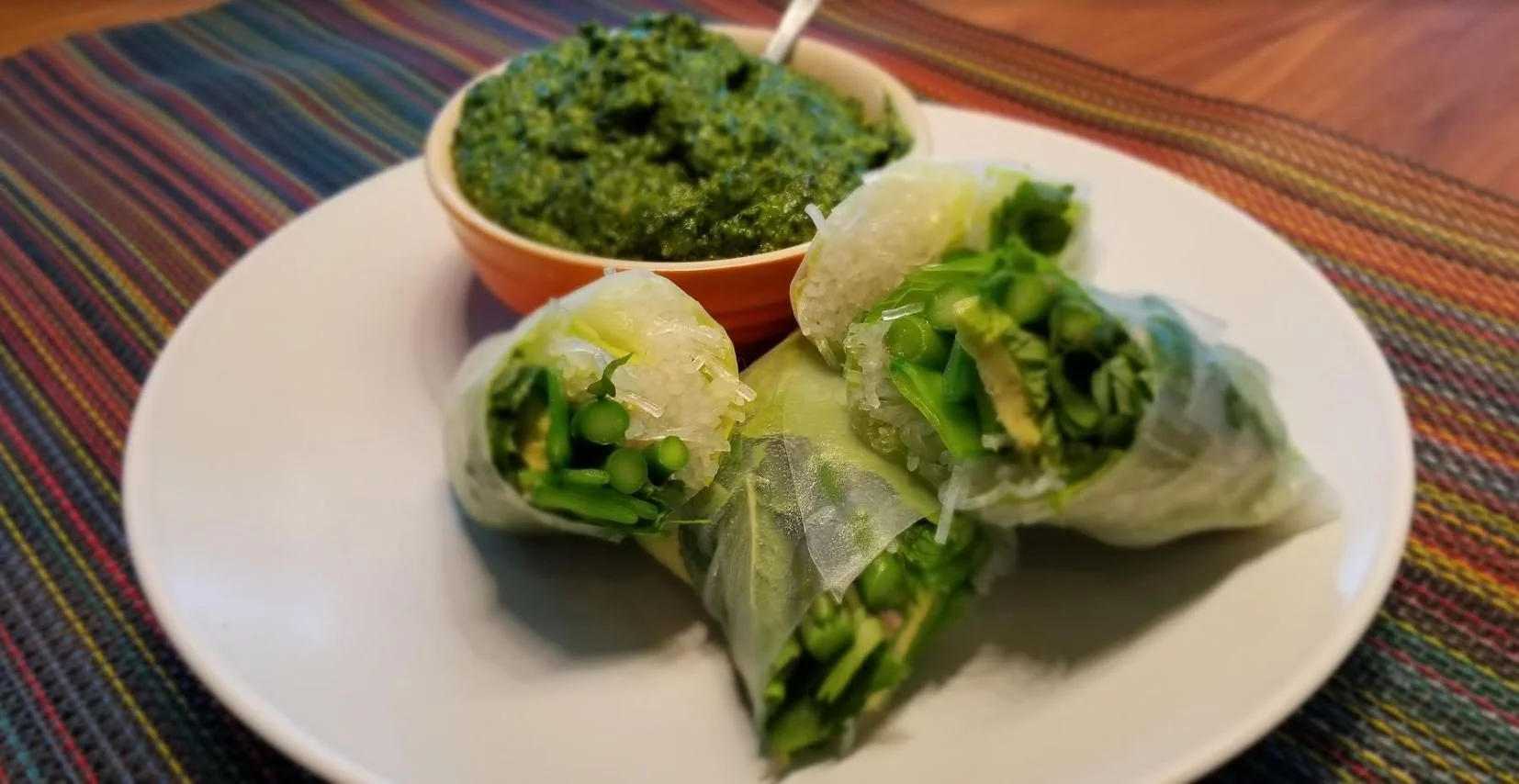 - To assemble the spring rolls, take a deep plate or pie pan that is larger than the rice paper rounds and pour in some lukewarm tap water. Working with one wrap at a time, dunk the rice paper into the water and allow to soak for 30 to 60 seconds to soften. Do not let the paper get too soft or it will break when rolling. When softened, lay it out on a flat cutting board and assemble your wrap filling. Starting at the edge of the rice paper closest to you (and leaving enough room to begin the rolling process), layer a piece of lettuce, followed by a small handful of vermicelli, an asparagus spear, a few snow peas, and avocado slices and a few basil, mint and cilantro leaves.